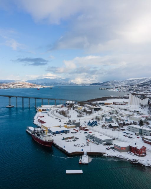 Drone shot of Tromsø in winter, showcasing the iconic Arctic Cathedral, Tromsø Bridge, snowy landscape, and surrounding waters under a clear blue Arctic sky - Shutterstock