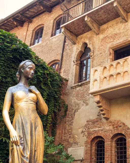 Bronze statue of Juliet and balcony by Juliet house, Casa di Giulietta in Verona, Italy - Shutterstock