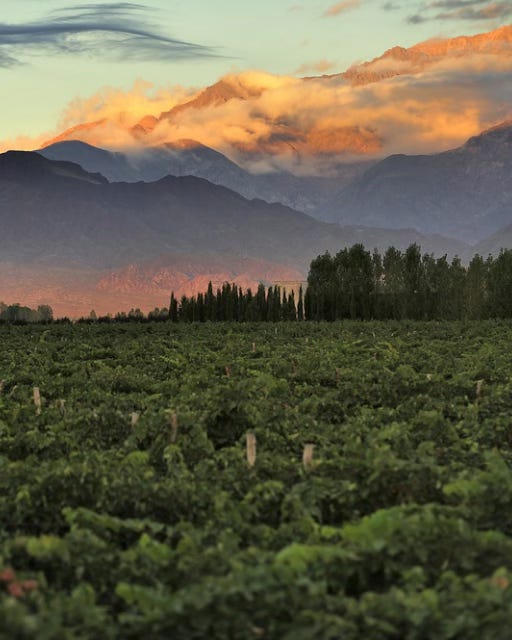 Sunrise over vineyard with snow capped mountains of Andes in Mendoza, the heart of wine making region in Argentina, famous for producing Malbec red wine - Shutterstock